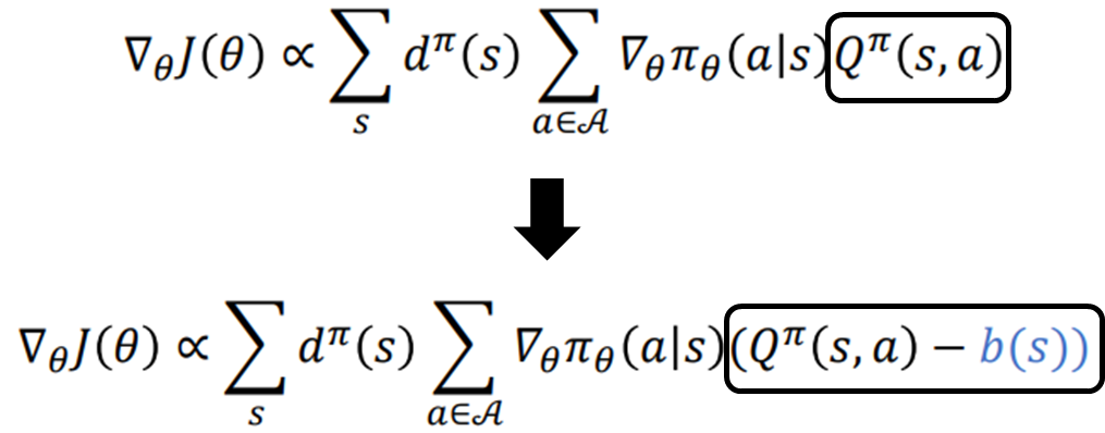 Qπ(s,a)에 Baseline이되는 어떠한 함수 b(s)를 빼주는 형태인데,