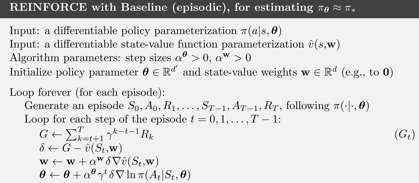 기준값을 선택하는 자연스러운 방법중 하나는 상태가치의 추정값 v̂(s,w)을 기준값으로 선택하는 것입니다.