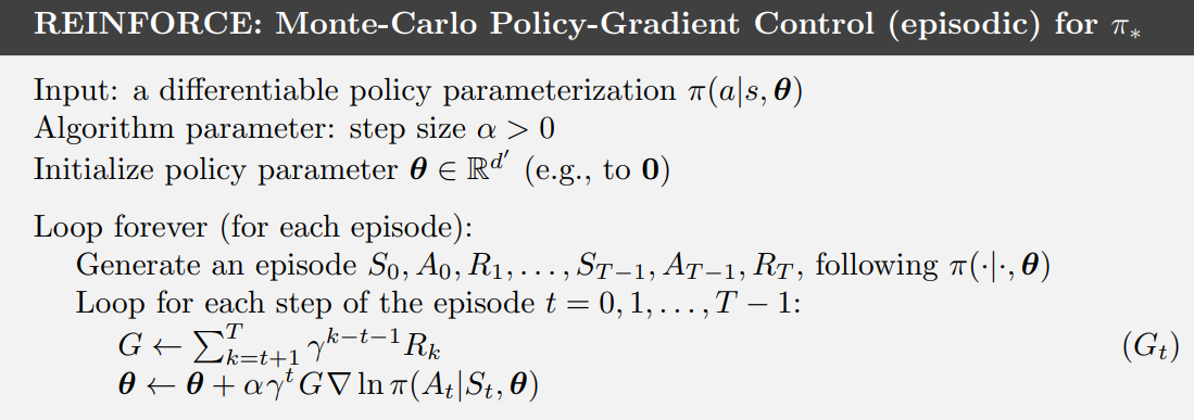 REINFORCE 알고리즘은 한마디로, "MC 방식의 Policy Gradient"라고 할 수 있습니다.